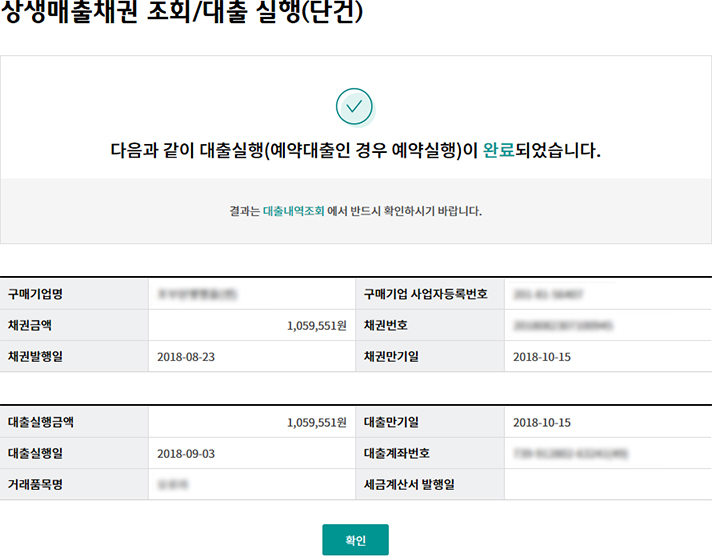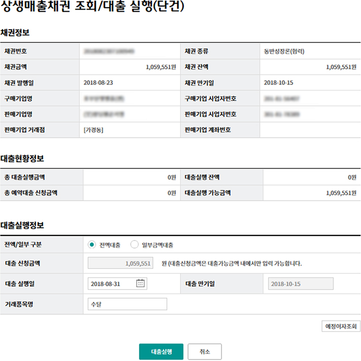Step 2. 대출금액, 대출실행일, 대출만기일, 거래품목명을 투입하고 대출실행 버튼을 클릭합니다.