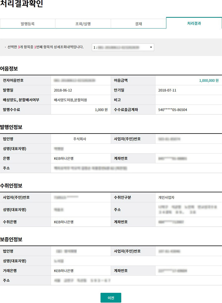 ① 상위 결재자가 존재할 경우 결재요청이 완료되며, 단독사용자일 경우 전자어음 발행작업이 완료됩니다.