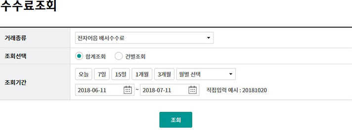 Step 1. 거래종류, 조회선택, 조회기간을 선택한 후 조회버튼을 클릭합니다.