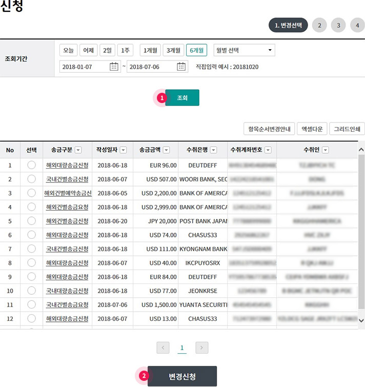Step 1. 기업뱅킹을 통해 신청한 송금 중 변경이 필요한 경우 내용변경을 신청합니다.