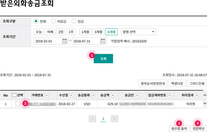 ① 기간별 받은 외화송금을 조회할 수 있습니다.